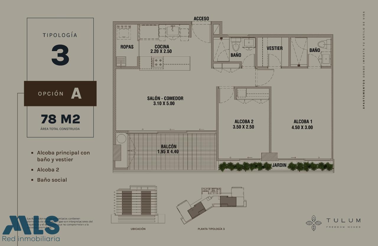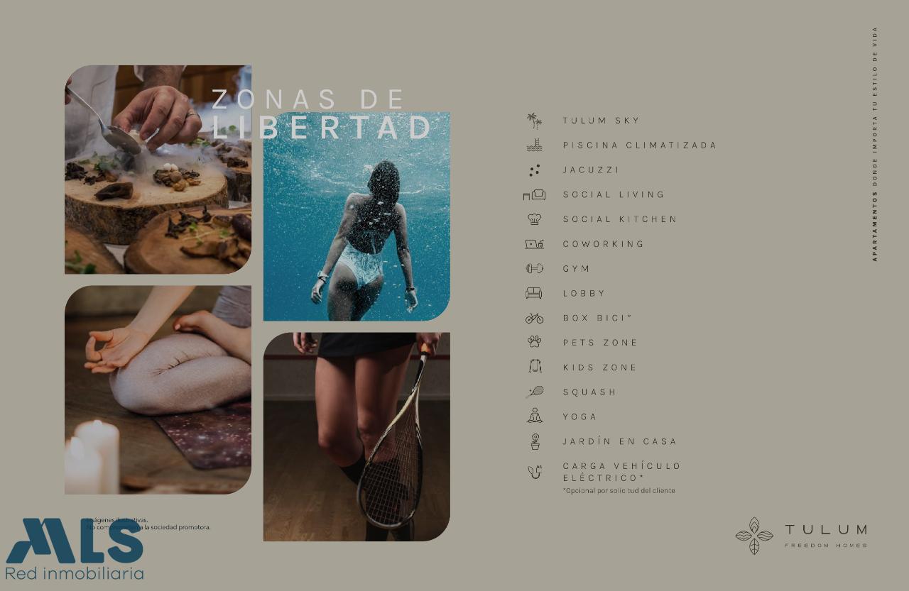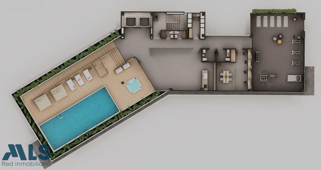 Apartamento de 2 habitaciones, la principal con baño y vestier; baño social completo, sala-comedor, cocina abierta con barra americana, zona de ropas, jardín en casa, cuarto útil, 2 parqueaderos sencillos. La unidad será una de las más completas de la zona, contará con: Portería 24 horas, Ascensor, Piscina climatizada, Jacuzzi, Social living, Cocina social, Coworking, Gimnasio, Zona y Pista Agility para mascotas, Juegos infantiles, Cancha de Squash, Zona de yoga, Box Bici (cuartos para guardar tu bicicleta) y Carga para vehículo eléctrico (opcional por solicitud del cliente).